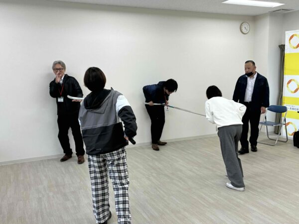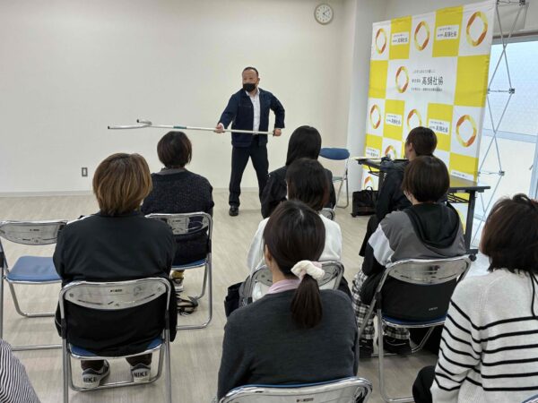 当社協では、不審者が来所した場合に対応できるようサスマタを購入したんですね。 買ったものの使い方がわからない・・・ そのため、高鍋警察署生活安全課 宮本様においでいただいて講習を行いましたよ。