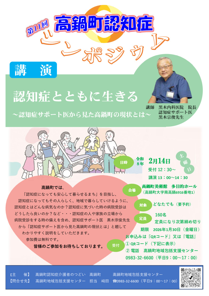 日時:令和8年2月14日(土) 受付 12:30 開会 13:00 終了予定 14:30 場所:高鍋町美術館多目的ホール 対象:どなたでも 定員:160名(定員になり次第締め切り) 申込期限:令和8年1月30日(金) 申込:電話 高鍋町地域包括支援センター 0983-32-6600 ※パソコンからQRコードが読みにくいので、電話にて申し込みください。